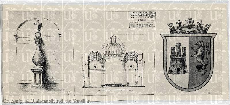 Cruz del atrio, sección transversal de la Catedral y Escudo de Mérida