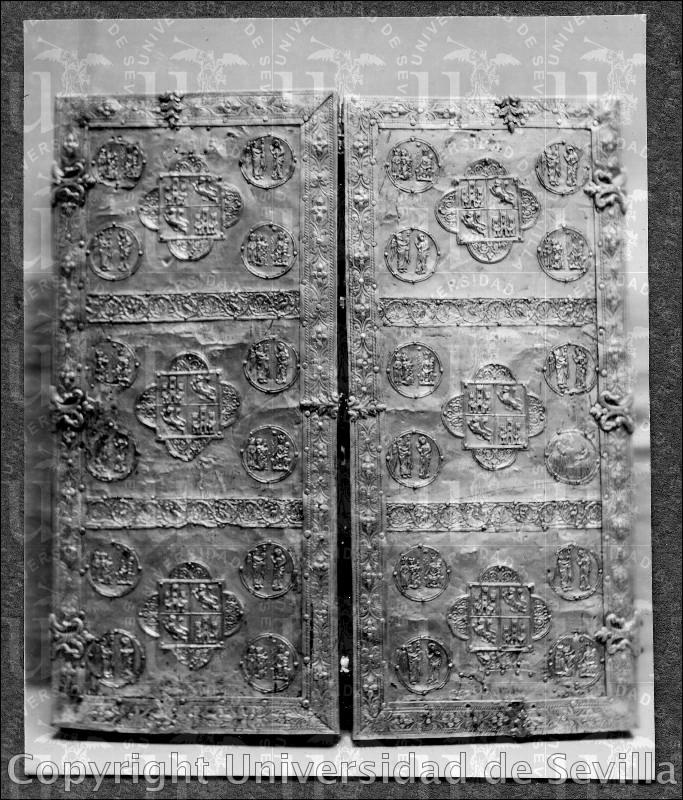COMENTARIOS: Obra de madera revestida en chapa de plata dorada. En los casetones de un anverso figuran reliquias cubiertas por cristal de roca |