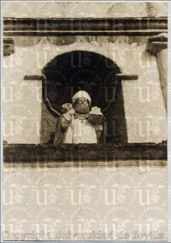Representación de un santo en la fachada principal del templo. Trasera: Sello de tinta azul de Laboratorios Julio